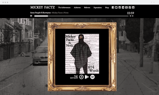 前面說到了視頻背景/動畫對于網(wǎng)站的作用。如果你是音樂家,為什么不向人們展示一下你的音樂才華呢?Mickey Factz就在自己的網(wǎng)站頁眉中加入了他的音樂,很有創(chuàng)意。