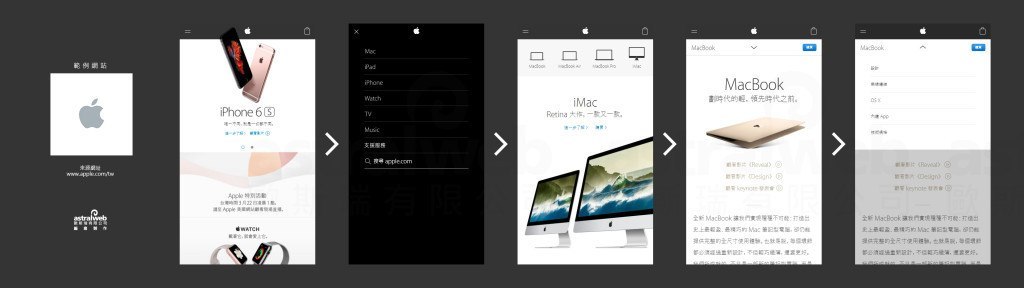 Apple選單使用跳頁方式呈現,在選擇產品大分類后,進入該類別的專頁,不使用相同的選單樣式,而選擇使用橫式滑塊,并使用分類圖做搭配,在第三層產品介紹項目頁面中,使用第二階層下拉選單。他將每一層做區分,并針對每一層的不同需求,而對應不同的選擇方式。