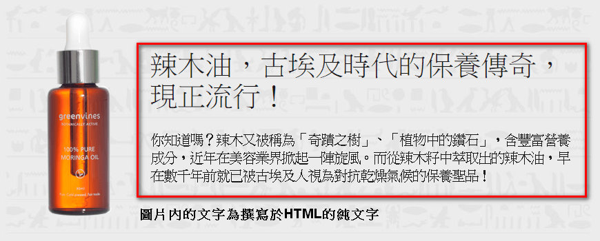 許多的網(wǎng)站都會(huì)有這樣的問題,可能是基于美觀或是設(shè)計(jì)方便,將文字制作在圖片內(nèi),但由于目前搜索引擎還不太能夠辨別圖片內(nèi)的文字,所以當(dāng)將頁面的文字都被制作于圖片內(nèi)時(shí),將會(huì)導(dǎo)致搜索引擎會(huì)判斷頁面的內(nèi)容過少,而影響頁面的搜索排名。當(dāng)我們將圖片文字化,可以讓頁面內(nèi)容豐富更有可能為頁面帶來更多的長尾關(guān)鍵字。